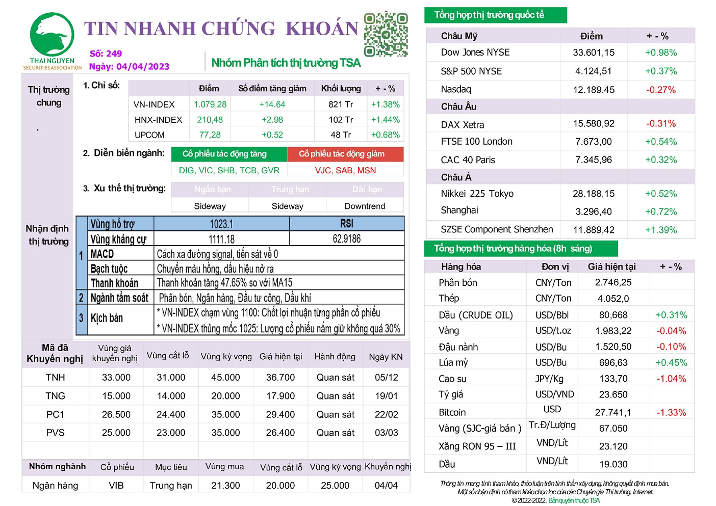- Thị trường đang hội tụ những tín hiệu cực kỳ tích cực cả về kỹ thuật và vĩ mô, dòng tiền cũng quay trở lại dần thị trường nên nhiều khả năng VN-Index sẽ tiếp tục xu hướng với mục tiêu hướng đến là vùng kháng cự mới 1.100- 1.120 điểm (đường MA200 và đỉnh sóng phục hồi vào tháng 01/2023) trong thời gian tới.