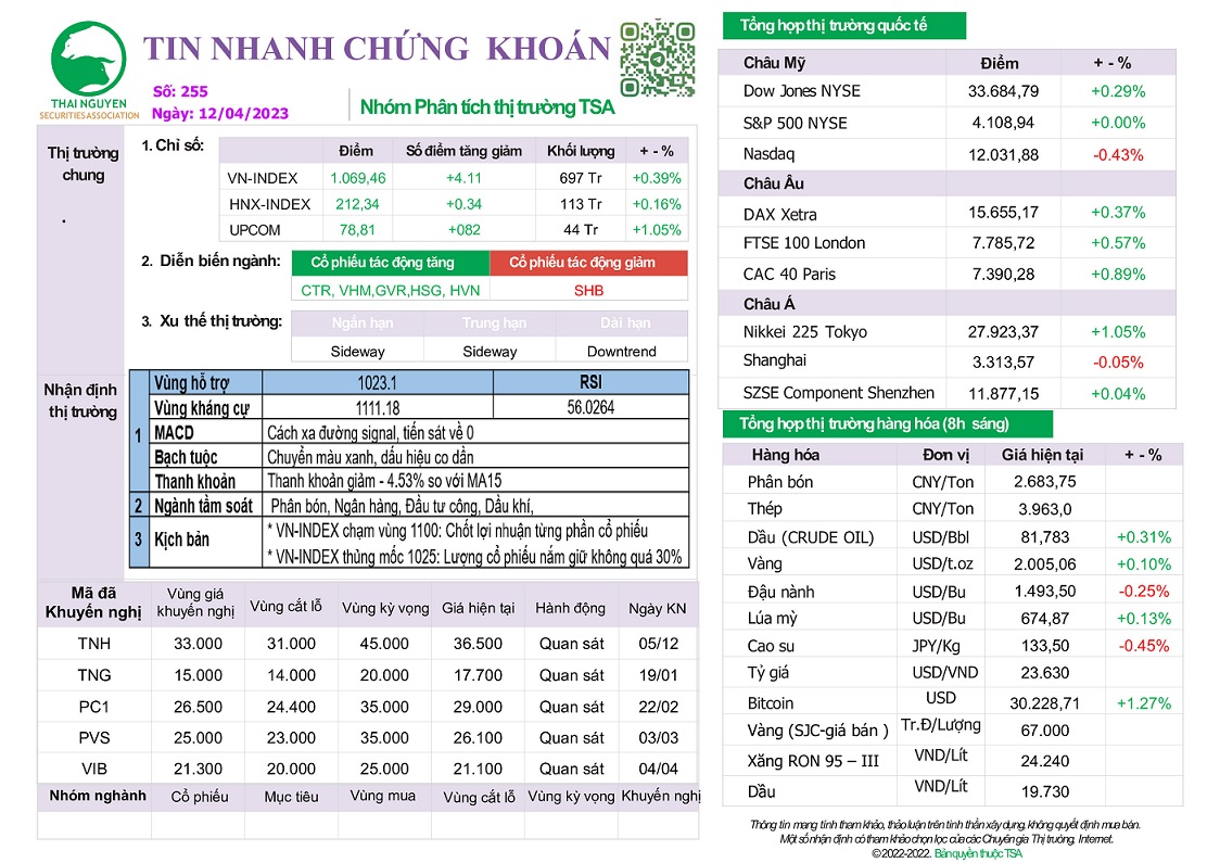 - Trong phiên giao dịch ngày 11/04/2023, tự doanh chứng khoán mua ròng 147,22 tỷ đồng, nhà đầu tư nước ngoài bán ròng 570,46 tỷ đồng.