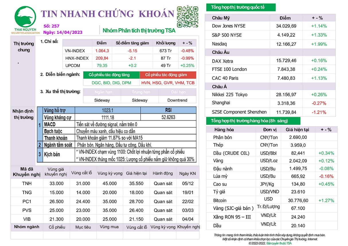 - Trong phiên giao dịch ngày 13/04/2023, tự doanh chứng khoán mua ròng 23,2 tỷ đồng, nhà đầu tư nước ngoài bán ròng 299,1 tỷ đồng.