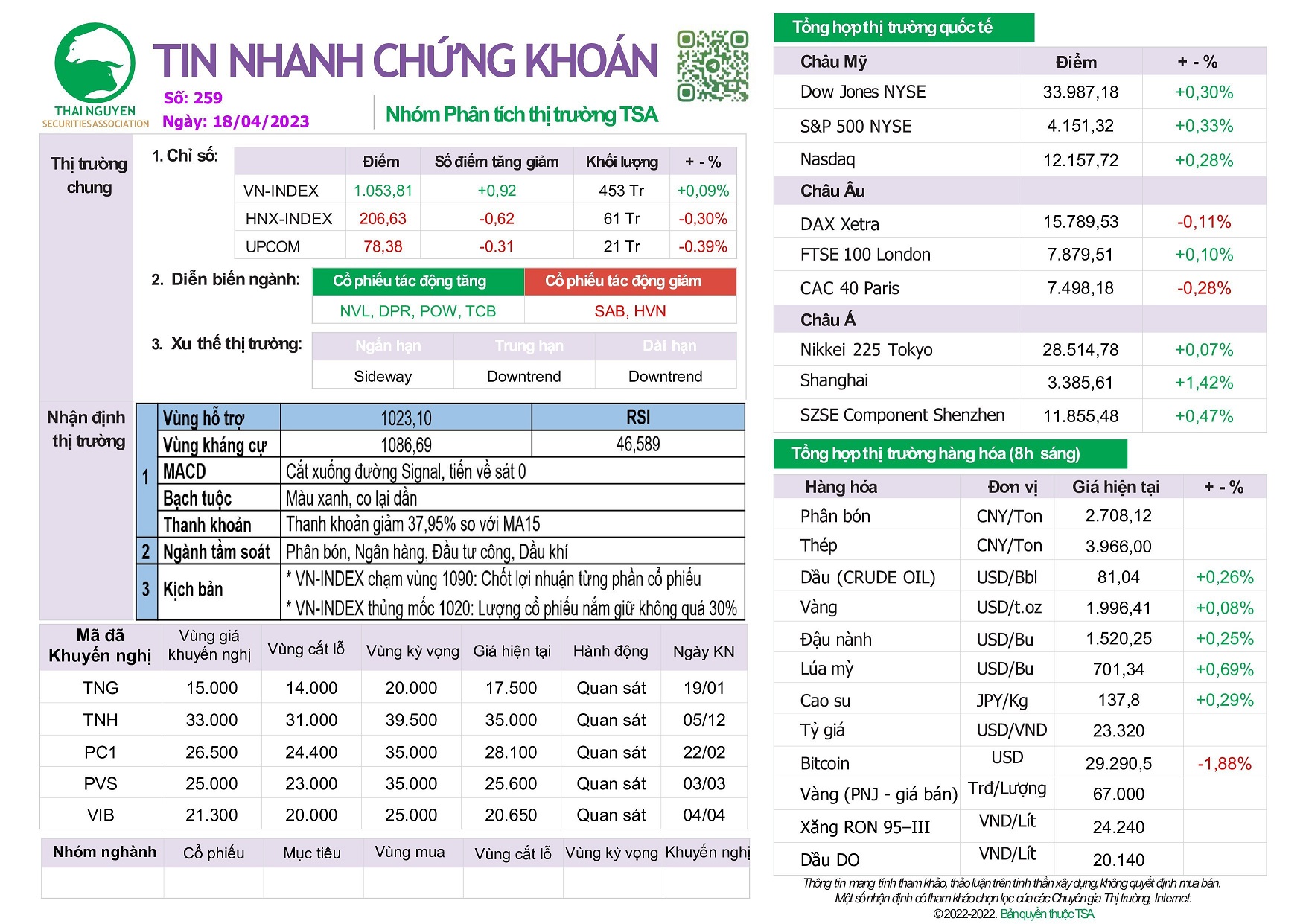 - Trong phiên giao dịch ngày 17/04/2023 tự doanh chứng khoán mua ròng 29,8 tỷ đồng, nhà đầu tư nước ngoài mua ròng 206 tỷ đồng.