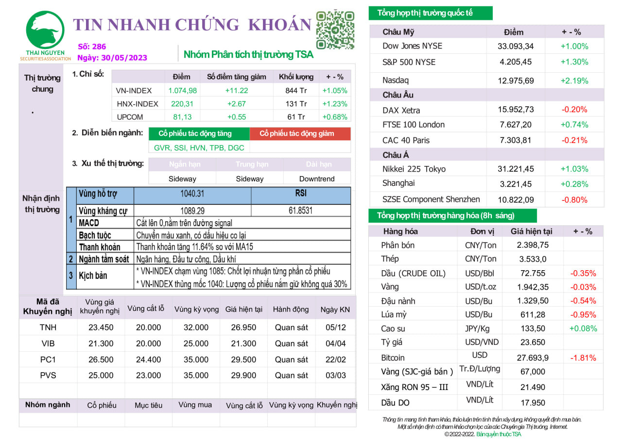 - Thị trường có thể sẽ tiếp tục đà tăng và chỉ số VN-Index có thể sẽ kiểm định lại vùng kháng cự 1.080-1.085 điểm trong phiên 30/05. Đồng thời, đồ thị giá của chỉ số VN-Index có dấu hiệu thoát khỏi mô hình tam giác (1 dạng mô hình tiếp diễn) cho thấy đồ thị giá có thể sẽ tiếp tục xu hướng tăng ngắn hạn và hướng về các mức cao hơn. Xu hướng ngắn hạn của thị trường chung vẫn duy trì ở mức tăng. Chỉ báo tâm lý tăng mạnh trở lại cho thấy các nhà đầu tư đã lạc quan hơn và giảm sự thận trọng.
