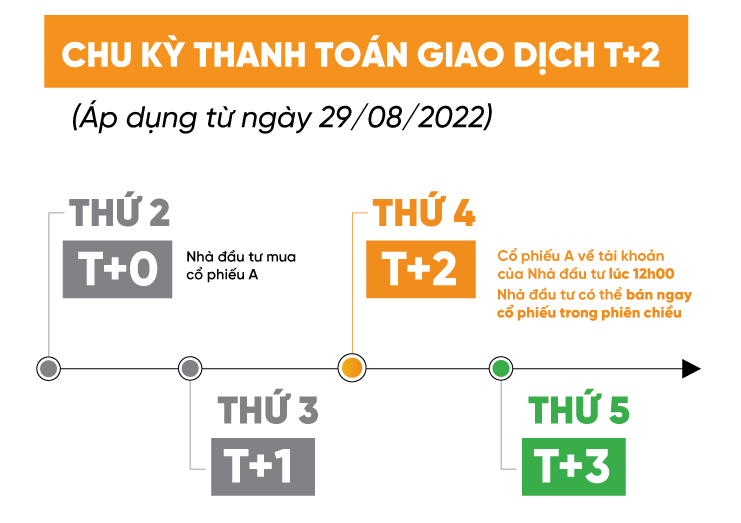 Ví dụ: Nhà đầu tư có giao dịch mua bán chứng khoán ngày 25/8 (ngày T+0) sẽ nhận được chứng khoán hoặc tiền trước 13h ngày 29/8 (ngày T+2) để có thể thực hiện mua bán chứng khoán trong phiên giao dịch buổi chiều cùng ngày.