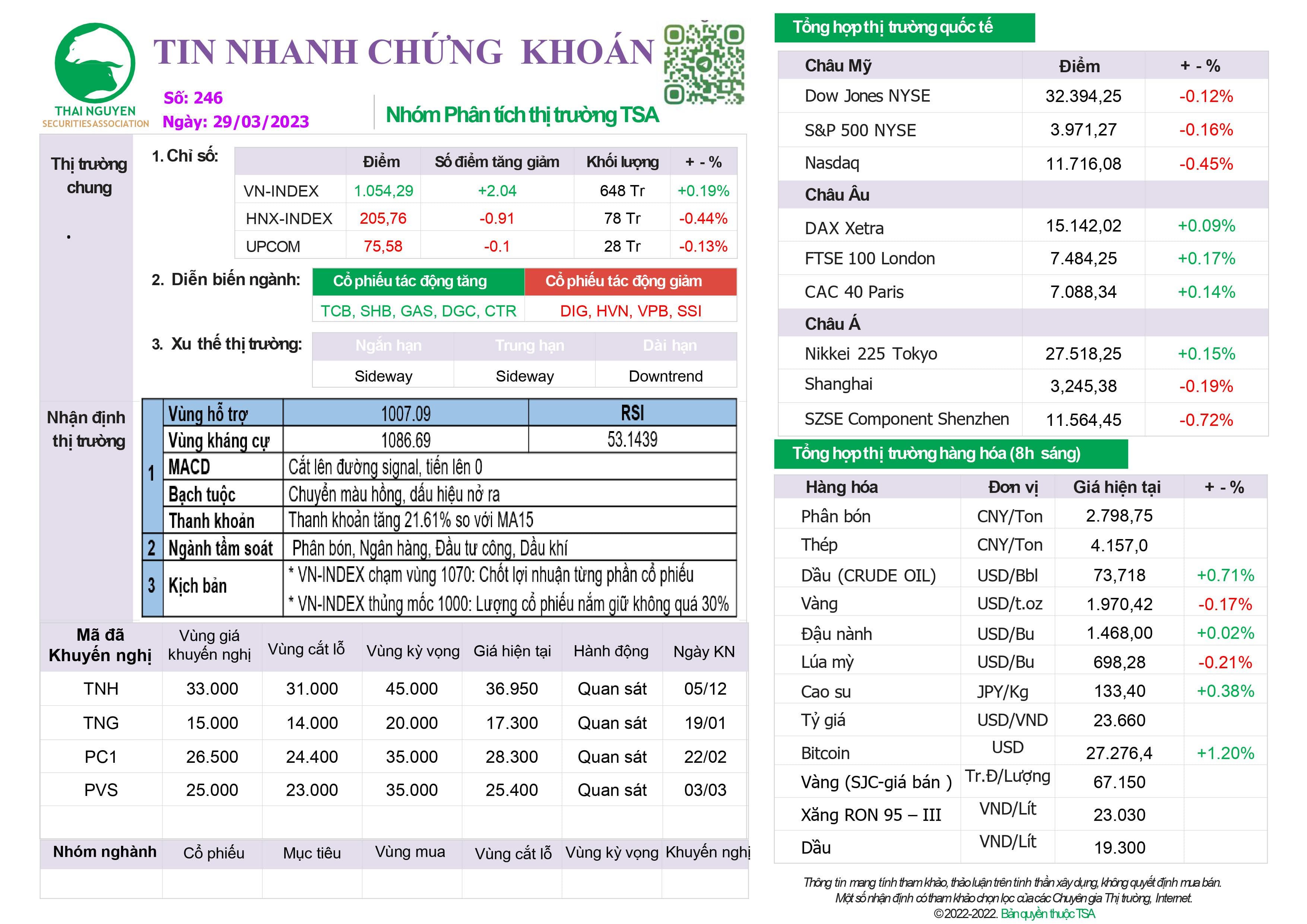 - VN Index có phiên tăng điểm (+2,04đ) tương đương với 0,19%. Khối lượng giao dịch tăng 21,65% mức bình quân 15 phiên. Vùng 1050-1060 điểm là vùng kháng cự khá mạnh trong ngắn do là nơi gặp nhau của các đường kênh giảm giá từ tháng 01/2023 đến nay, đường MA50 và đường tiệm cận trên của dải Bollinger Band nên có khả năng VN-Index sẽ rung lắc mạnh trong vùng kháng cự mạnh